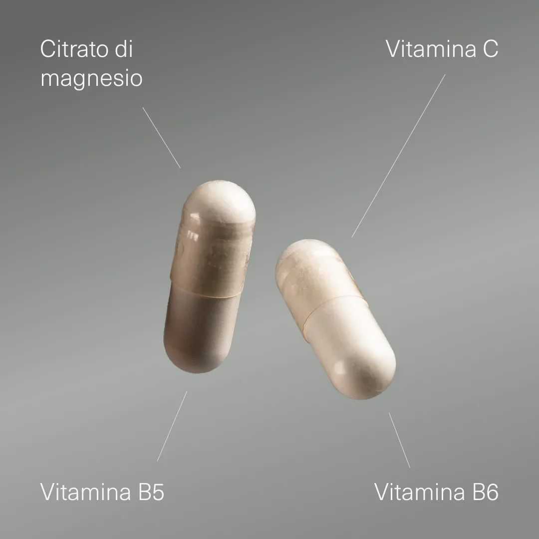 Magnesio con vitamina C, B5 e B6 è presentato in un contenitore da 200 capsule, sufficiente per 100 giorni.